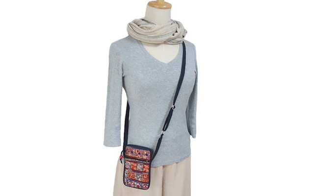 モン(Hmong)族のクロスステッチ刺繍が両面にぎっしりと施された、豪華な刺繍ショルダーバッグです。 *モン(Hmong)族の刺繍文様の意味についてはhttps://orijin.asia/category/motif/ 底マチはありませんが、貴重品を持ち歩くのにちょうどよいサイズで、使い勝手のよいサイズとデザインです。 バッグの口部分はファスナー開閉ですので、貴重品などを入れて持ち歩くのに安心。 裏側にはファスナーポケットがついており、中にも、ポケットが2つ(1つはファスナーポケット)がついていますので、小物もわけて入れられ、普段使いに、ご旅行に、重宝にお使いいただけます。 *両面とも刺繍されていますので、ファスナーのある面を前にしても、どちらでもお使いいただけます。 *肩紐の長さは調整可能で、刺繍に合う合皮紐2本をつなぎ合わせたデザインになっています。 *刺繍してある地の布はブルーグレー、ファスナー、裏地、肩紐はすべて黒色です。 サイズ: タテ約26m×ヨコ約21cm/肩ひも約73-137m(調節可)/マチなし 素 材: タイ北部モン(Hmong)族のクロスステッチ刺繍布(綿) 縫 製: タイ北部の山岳(少数)民族の村 民 族: モン(Hmong)族 在 庫: 1点 送 料: 総額1,500円(税込)以上で送料無料 *「クリックポスト(日時指定不可/ポスト等への投函)」でのお届けとなります。