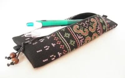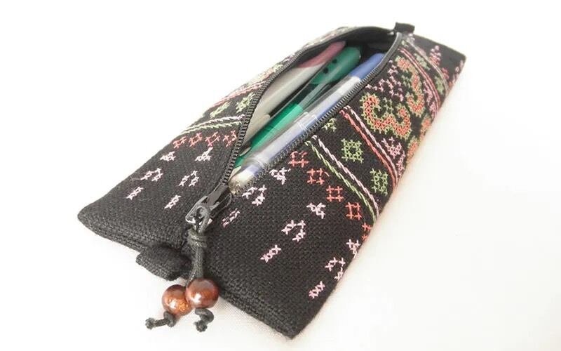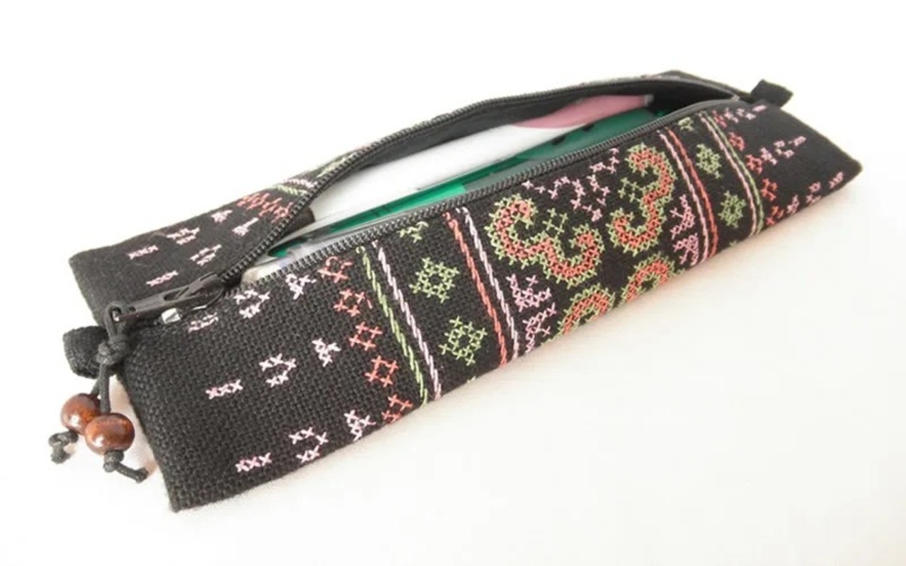 モン族のクロスステッチ刺繍が施された薄型のペンケースです。裏面にも刺繍があります。
