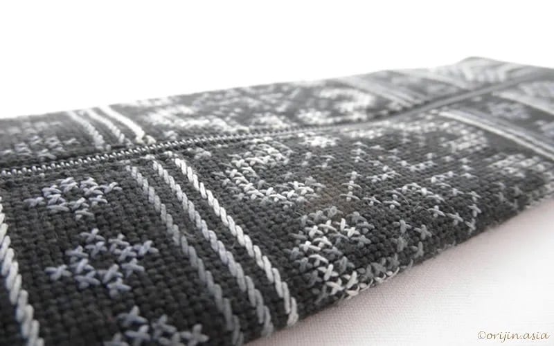 モン(Hmong)族のクロスステッチ刺繍が施された薄型のペンケースです。裏面にも刺繍があります。