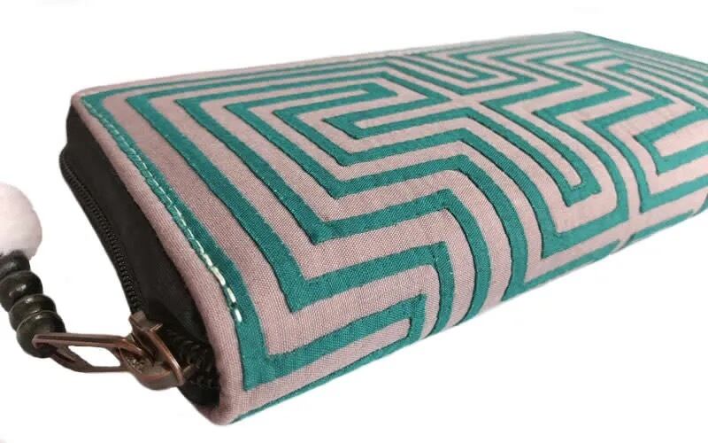 モン(Hmong)族の迷路柄アップリケのファスナー式ぼんぼん付き長財布です。
