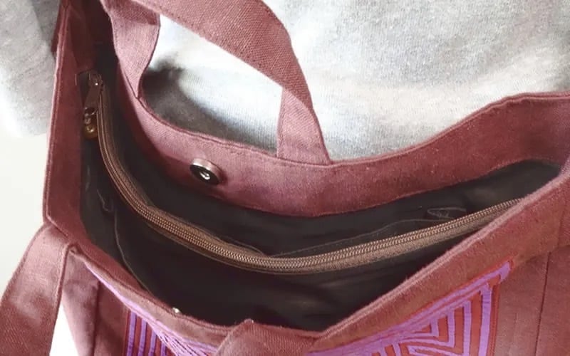 口部分はマグネットボタン開閉ですが、内側にはファスナーポケットの仕切りがありますので、荷物をわけて入れることができ、貴重品も安心なデザインです。