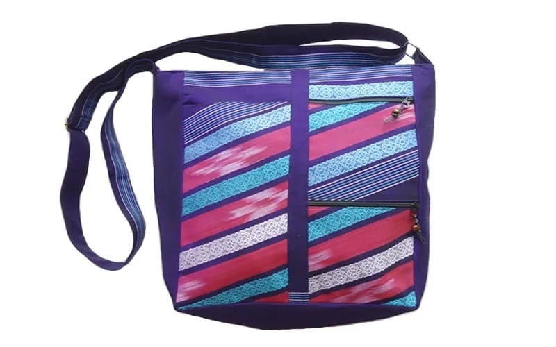 タイ北西部ミャンマー(ビルマ)国境のカレン族の村の人たちが手織りしている伝統的な民族柄の布を使った、ポケットのたくさん付いたショルダーバッグです。
