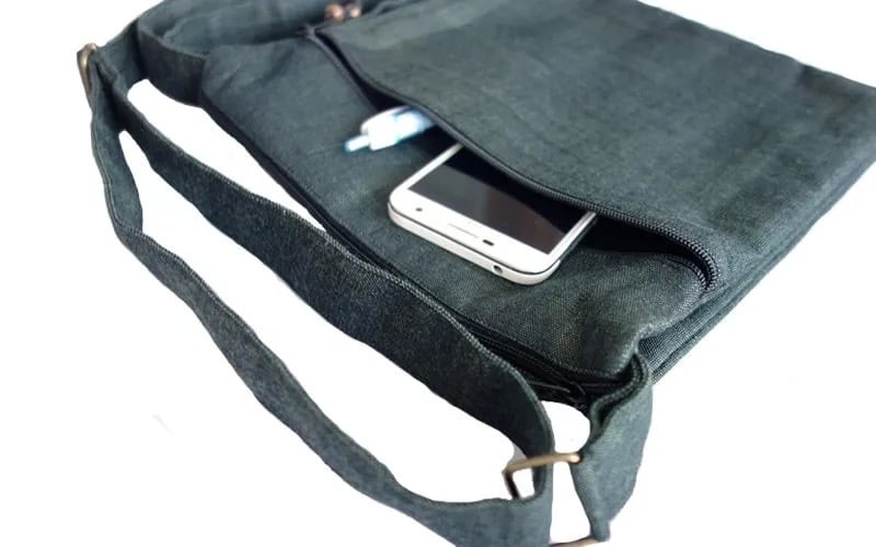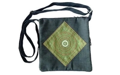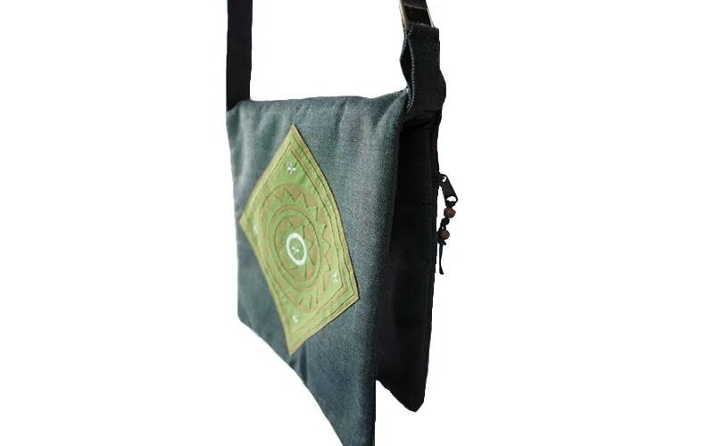 前面にリバースアップリケのモン族の文様が入った二つ折りデザインのショルダーバッグです。