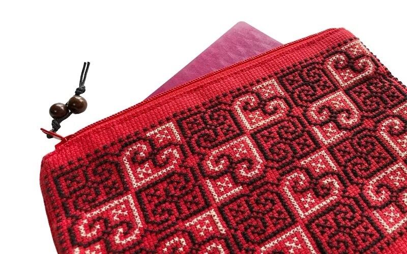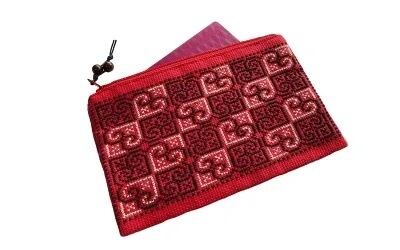 モン(Hmong)族のクロスステッチ刺繍の赤いポーチでです。