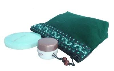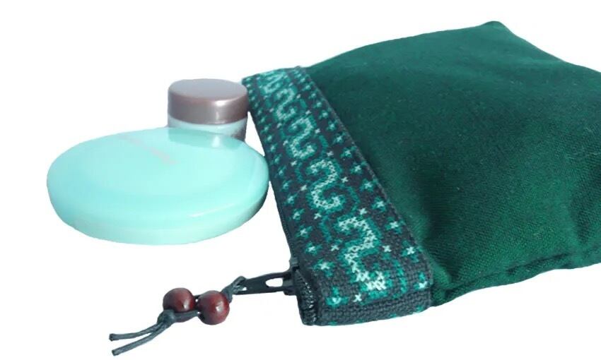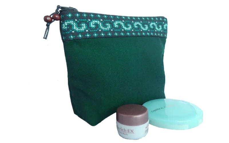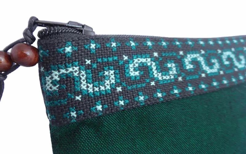 ポーチの口部分には、モン(Hmong)族の細かなクロスステッチ刺繍がライン状に縫い合わせてあり、独特な光沢のあるカレン族の無地布とよく合っています。