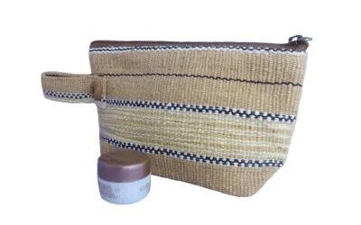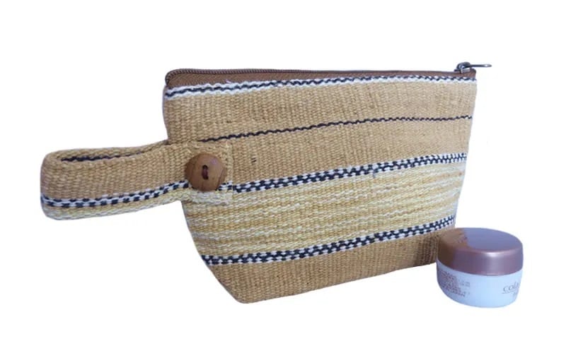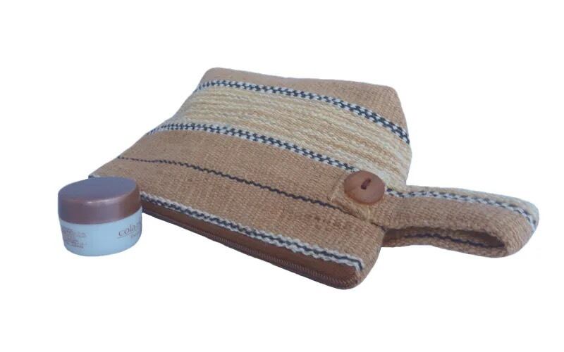 しっかりとした厚手の手織り布に、木製のボタンがかわいいポーチです。