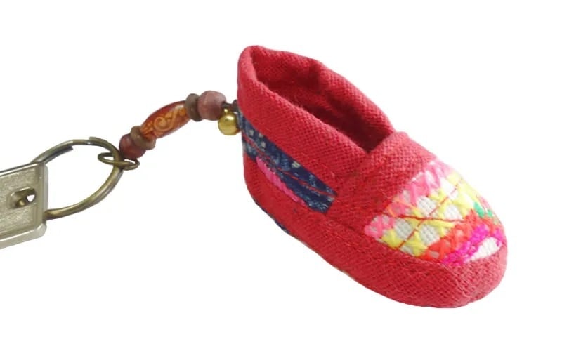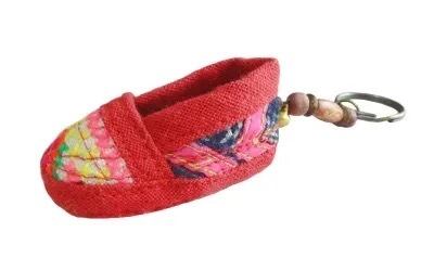 モン(Hmong)族の刺繍布で作った小さな赤いくつのキーホルダーです。
