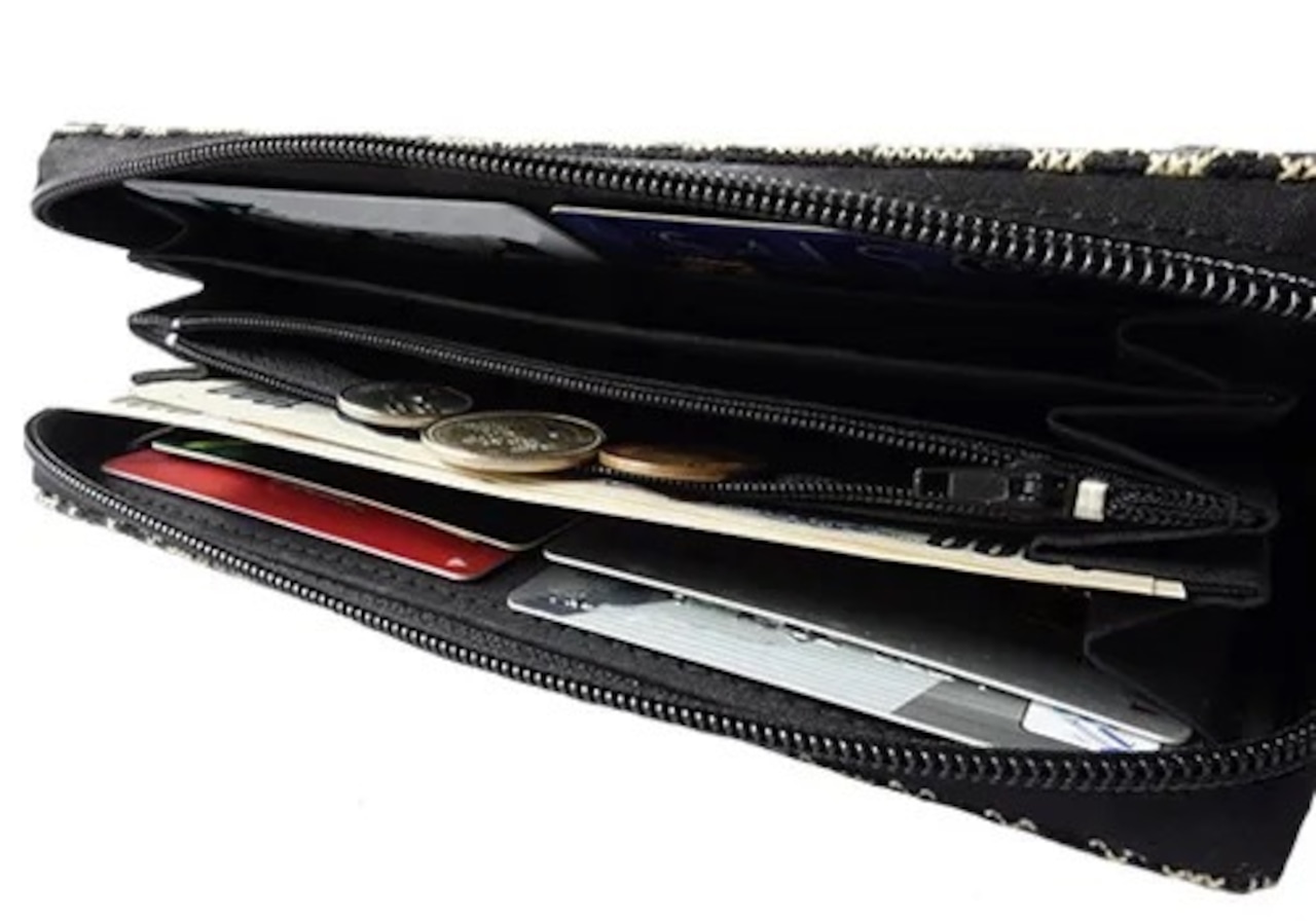 紙幣サイズのポケット4ヶ所と、小銭入れ用ファスナーポケットが1つあり、カードは、両側に入れられます。
