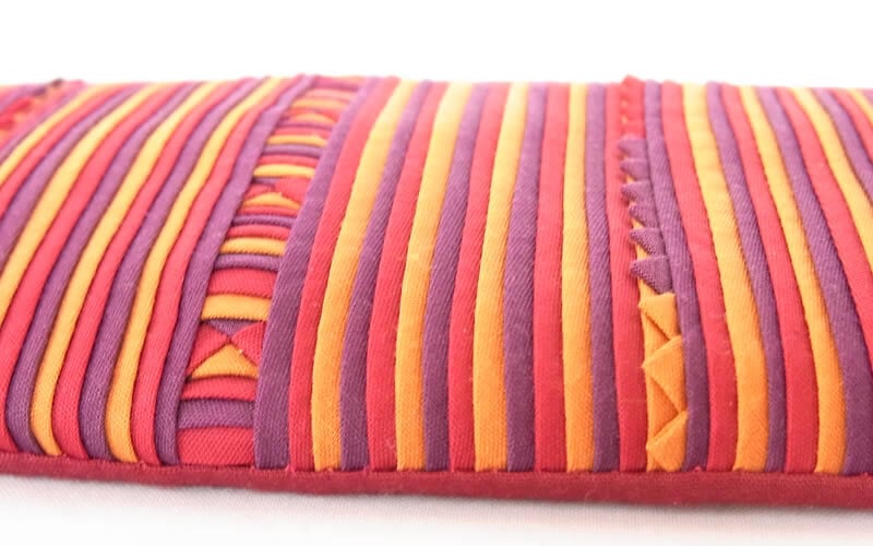 布を細く折りたたみ、異なる色の布を、何重にも重ねて縫い合わせていくのが特徴です。