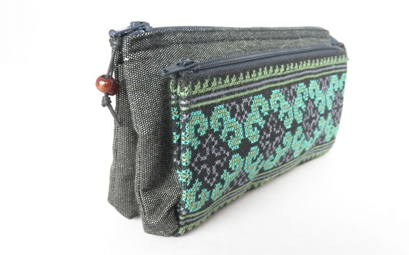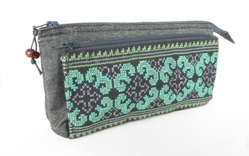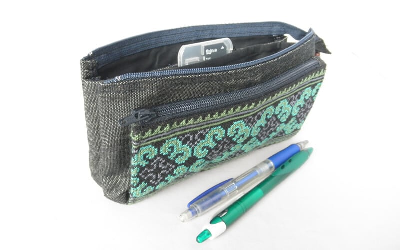 モン(Hmong)族のクロスステッチ刺繍のマチ付きポケットが前面にあり、内側にも4つのポケットがある、