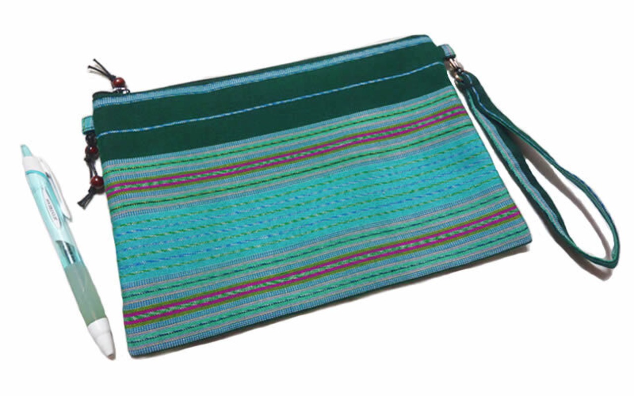 NAPR5-1 カレン手織り布の3つファスナーポーチL(GrAqP)