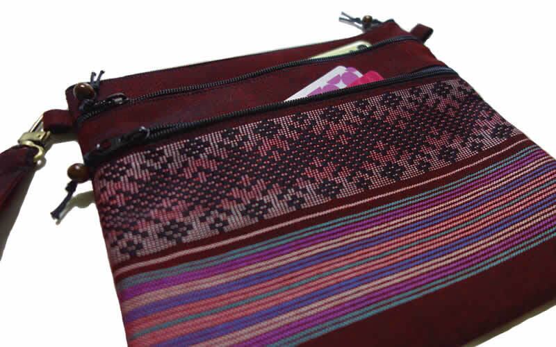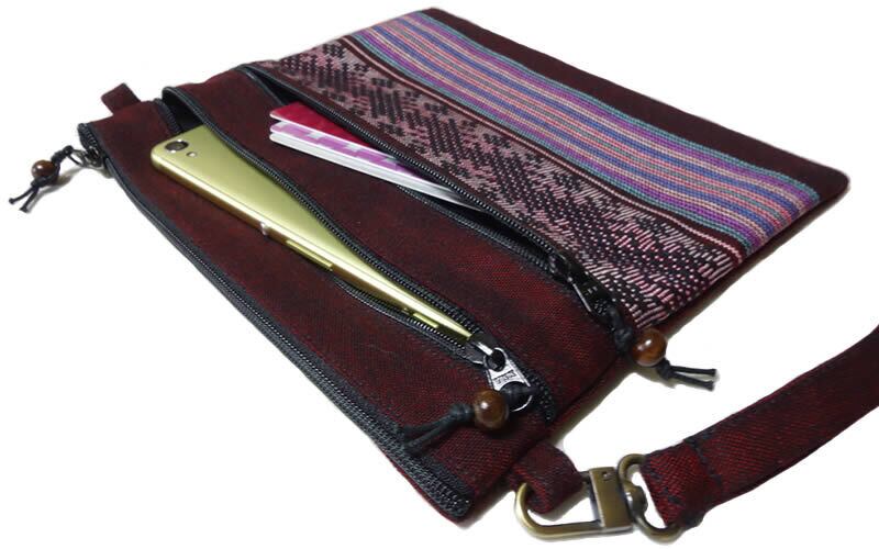 スカートのように腰に巻いて普段使いしているカレン族の手織り布で作った3つファスナーポーチです。